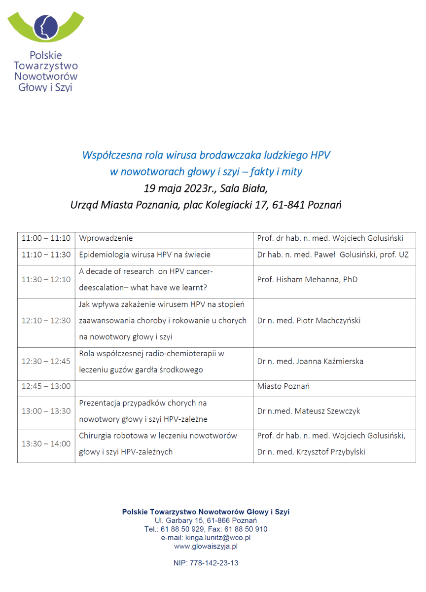 W imieniu Polskiego Towarzystwa Nowotworów Głowy i Szyi zapraszam Państwa na otwartą konferencję, zorganizowaną wspólnie z Prezydentem Miasta Poznania – Panem Jackiem Jaśkowiakiem, na temat znaczenia wirusa brodawczaka ludzkiego w rozwoju nowotworów głowy i szyi. Gościem specjalnym będzie światowej sławy ekspert w dziedzinie nowotworów głowy i szyi oraz wirusów onkogennych, jakim jest wirus brodawczaka ludzkiego, prof. Hisham Mehanna – Dyrektor Head and Neck Surgery, The Institute for Global Innovation & the Institute for Advanced Studies University of Birmingham. Poprosiliśmy o prezentację naszych ekspertów, którzy w sposób bardzo czytelny przedstawią różne aspekty związane z diagnostyką, leczeniem i rokowaniem chorych na nowotwory głowy i szyi. Poruszymy też niezwykle ważny problem szczepień populacyjnych – dziewczynek i chłopców, przeciwko wirusowi brodawczaka ludzkiego w naszym kraju. Charakter naszego spotkania ma otwartą formułę, a informacje płynące z wykładów będą zrozumiałe dla szerszego grona odbiorców. Obecność Państwa na naszym spotkaniu będzie dla nas wyróżnieniem. Sądzę, że spełnimy Państwa oczekiwania.